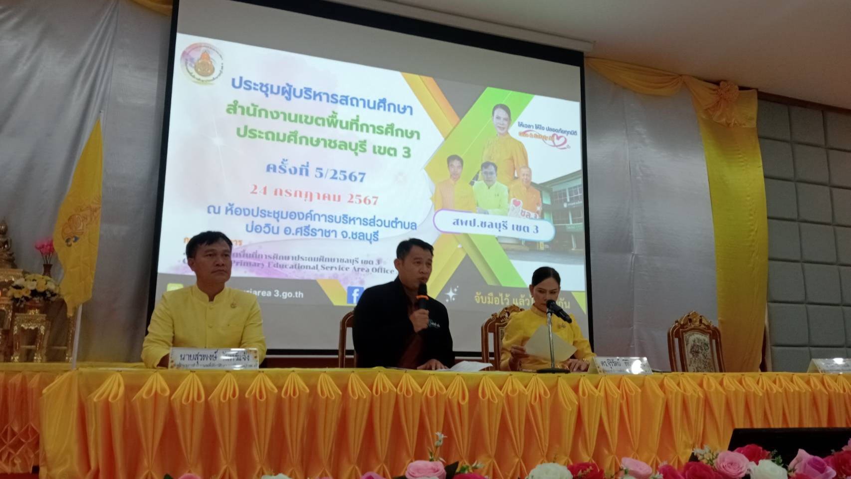 เมื่อเวลา09.00น.ของวันที่24ก.ค. ที่อาคารเอนกประสงค์ภายในองค์การบริหารส่วนตำบลบ่อวิน อ.ศรีราชา จ.ชลบุรีโดยนายสิรวิชฐ์ อำไพวงษ์ นายก อบต.บ่อวิน กล่าวให้การต้อนรับ ดร.จุรีรัตน์ พินิจมนตรี ผู้อำนวยการสำนักงานเขตพื้นที่การศึกษาประถมศึกษาชลบุรี เขต 3 เป็นประธานในการประชุมผู้บริหารสถานศึกษา ผู้อำนวยการกลุ่มครั้งที่5/2567