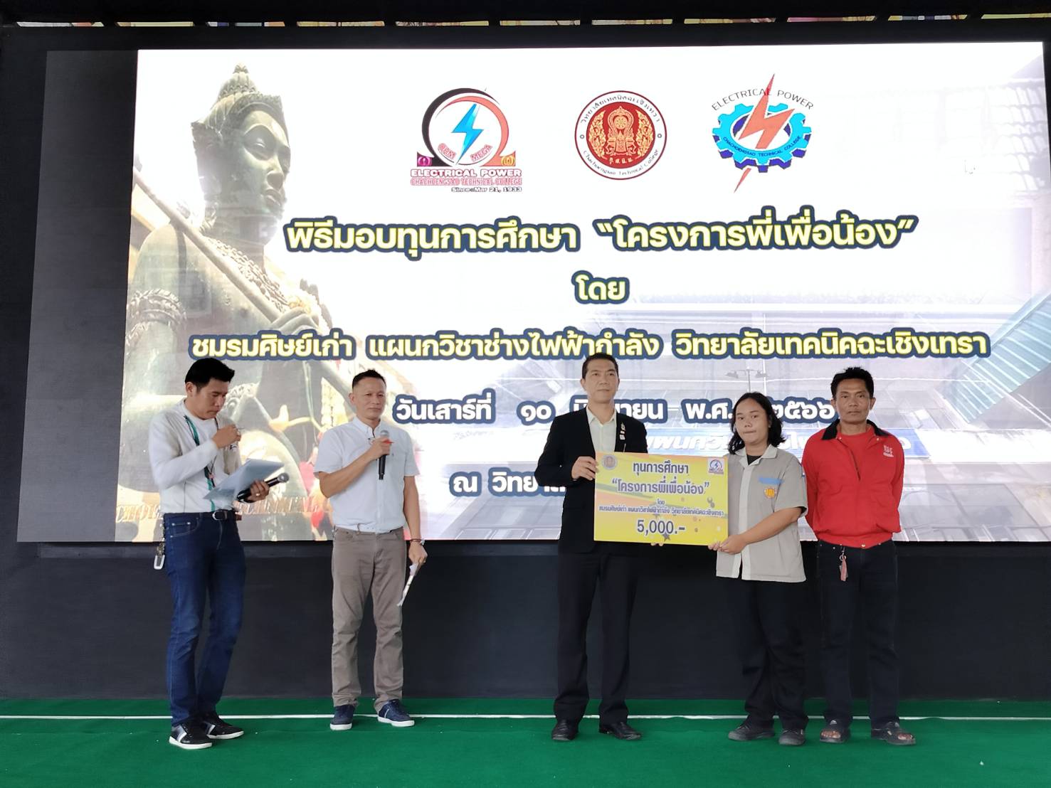 วันที่ 10 มิถุนายน 2566 ที่วิทยาลัยเทคนิคฉะเชองเทรา ได้จัดพิธีมอบทุนการศึกษา “โครงการพี่เพื่อน้อง” โดย ชมรมศิษย์เก่า แผนกวิชาช่างไฟฟ้ากำลัง วิทยาลัยเทคนิคฉะเชิงเทรา โดยมีนายรุ่งเรือง สูยะนันทน์ รอง ผอ.ว.เทคนิคฉะเชิงเทรา เป็นประธานในพิธี ร่วมด้วย คณะศิษย์เก่า /คณะ ผู้บริหารวิทยาลัยเทคนิคฉะเชิงเทรา/ คณะครูอาจารย์ และนักเรียนเข้าร่วมในพิธี