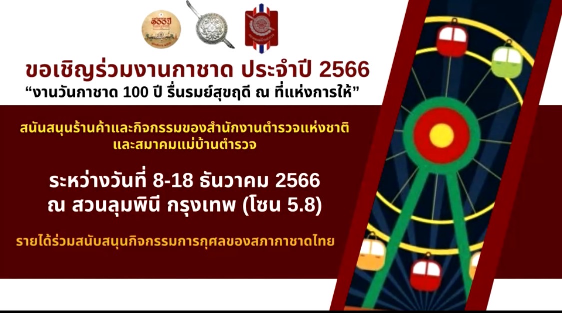 พล.ต.ต.หญิง สมพร พูลเกษม ผู้บังคับการกองสารนิเทศ เปิดเผยว่า ด้วยสภากาชาดไทยจัดงานกาชาดประจำปี 2566 ระหว่างวันที่ 8 – 18 ธันวาคม 2566 ณ สวนลุมพินี กรุงเทพมหานคร และทางระบบ Online ภายใต้แนวคิด “งานวันกาชาด 100 ปี รื่นรมย์สุขฤดี ณ ที่แห่งการให้” พร้อมเชิญชวนผู้เข้าร่วมงานย้อนวันวานด้วยการ “นุ่งโจงห่มไทยเที่ยวงานวันกาชาด” โดยในปีนี้สำนักงานตำรวจแห่งชาติ และสมาคมแม่บ้านตำรวจ ร่วมออกร้านในงานกาชาดด้วยเช่นกัน ณ โซน 5