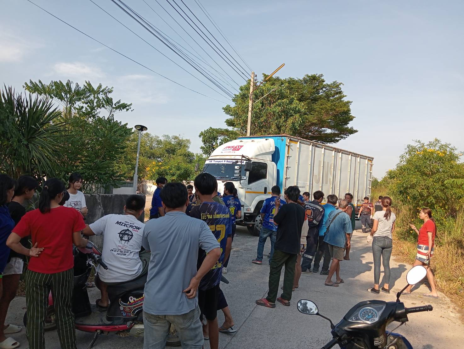 ซึ่งเป็นรถของผู้บาดเจ็บ ใกล้กันพบรถบรรทุก 6 ล้อตู้ทึบ ยี่ห้อ อีซุซุ สีขาว ทะเบียน 72-0625 ชลบุรีมีร่องรายการเฉี่ยวชน บริเวณไฟหน้าด้านซ้าย หลังจากนั้นเจ้าหน้าที่ตำรวจได้สอบถาม นายเล็ก อมกลิ่น อายุ 60ปีคนขับทราบว่ากำลังจะเลี้ยวเข้าบริษัทเพื่อนำรถมาเก็บช่วงจังหวะนั้นรถจักรยานยนต์หลุดช่วงโค้งมาชนเข้ารถตนเองอย่างจังจนทำให้มีผู้ได้บาดเจ็บ ทางเจ้าหน้าที่ตำรวจจะทำการสอบสวนพยานแวดล้อมอีกครั้ง