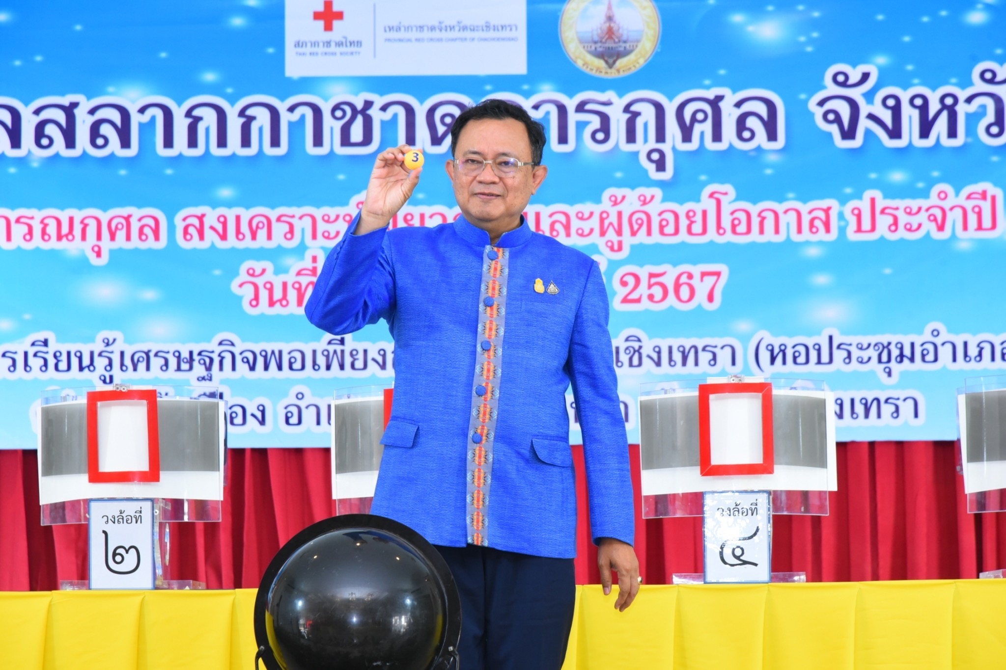 วันที่ 22 กุมภาพันธ์ 2567 ที่ศูนย์การเรียนรู้เศรษฐกิจพอเพียงอำเภอเมืองฉะเชิงเทรา (หอประชุมอำเภอเมืองฉะเชิงเทรา) ตำบลหน้าเมือง อำเภอเมืองฉะเชิงเทรา นายชลธี ยังตรง ผู้ว่าราชการจังหวัดฉะเชิงเทรา พร้อมด้วย นางพัทธานันท์ ยังตรง นายกเหล่ากาชาดจังหวัดฉะเชิงเทรา ประธานแม่บ้านมหาดไทยจังหวัดฉะเชิงเทรา เข้าร่วมการหมุนวงล้อเพื่อออกสลากกาชาดการกุศลจังหวัดฉะเชิงเทรา ประจำปี 2567 โดยมีคณะกรรมการและเจ้าหน้าที่ที่จังหวัดแต่งตั้งขึ้นต่อหน้าประชาชน แขกผู้มีเกียรติ และผู้ร่วมเป็นสักขีพยานในงานการออกรางวัลสลากกาชาดการกุศลจังหวัดฉะเชิงเทรา