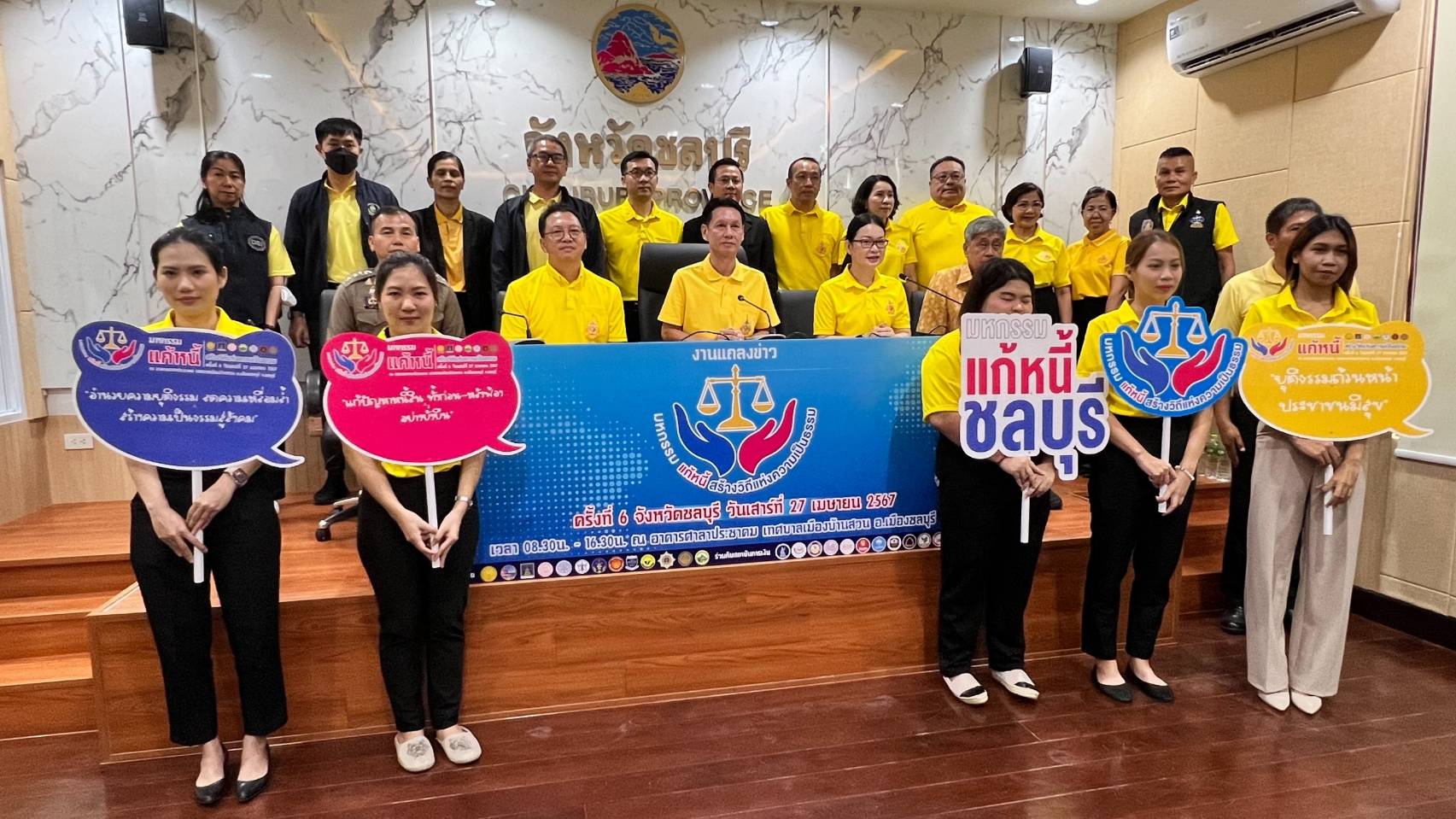 นายอํานาจ เจริญศรี รองผู้ว่าราชการจังหวัดชลบุรี เป็น ประธาน แถลงข่าว “มหกรรมแก้หนี้ สร้างวิถีแห่งความเป็นธรรม” ครั้งที่ 6 โดยมีพ.ต.อ.ชาตรี สุขศิริ รอง ผู้บังคับการตำรวจภูธรจังหวัดชลบุรี เข้าร่วมด้วย ที่จะมีขึ้น ในวันที่ 27 เมษายน 2567 ณ ศาลาประชาคม เทศบาลเมืองบ้านสวน อำเภอเมือง จังหวัดชลบุรีนายอำนาจ เจริญศรี รองผู้ว่าราชการจังหวัดชลบุรี ได้กล่าวเชิญชวนพี่น้อง ประชาชนชลบุรี ที่มีปัญหาหนี้สิน ไม่ว่าจะเป็น ลูกหนี้กองทุนเงินให้กู้ยืมเพื่อการศึกษา หนี้เช่าซื้อรถยนต์ หนี้สิน ข้าราชการ หนี้บัตรเครดิต และสินเชื่อส่วนบุคคลที่ผิดนัดชําระหนี้เข้าเกณฑ์จะถูกฟ้องดําเนินคดี หรือไม่มีกําลัง ผ่อนชําระตามสัญญา ได้เข้าสู่กระบวนการไกล่เกลี่ย ในงาน “มหกรรมแก้หนี้ สร้างวิถีแห่งความเป็นธรรม” ครั้งที่ 6 จังหวัดชลบุรี ในวันดังกล่าว โดยลูกหนี้จะได้รับโปรโมชั่นนอกจากจะไม่ถูกฟ้องคดี ไม่ถูกยึดทรัพย์ ไม่ถูกขายทอดตลาด แล้วยังจะได้รับ สิทธิพิเศษ ส่วนลดจบหนี้ ส่วนลดดอกเบี้ย ลดค่างวดและขยายระยะเวลาการผ่อนชําระ และสิทธิประโยชน์อื่นๆ อีกมากมาย ภายในงานมีการให้บริการต่างๆ มายมาย เช่น การเผยแพร่ความรู้ทางกฎหมาย และการสร้างการ ตระหนักรู้ เกี่ยวกับ การวางแผน และสร้างวินัยทางการเงิน การจัดนิทรรศการประชาสัมพันธ์ ให้คําปรึกษาทาง กฎหมาย ซึ่งมีสถาบันการเงินและหน่วยงานที่เกี่ยวข้องเข้าร่วมงานในครั้งนี้