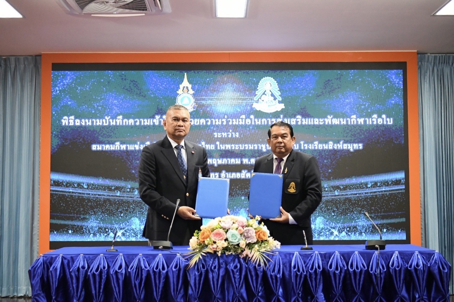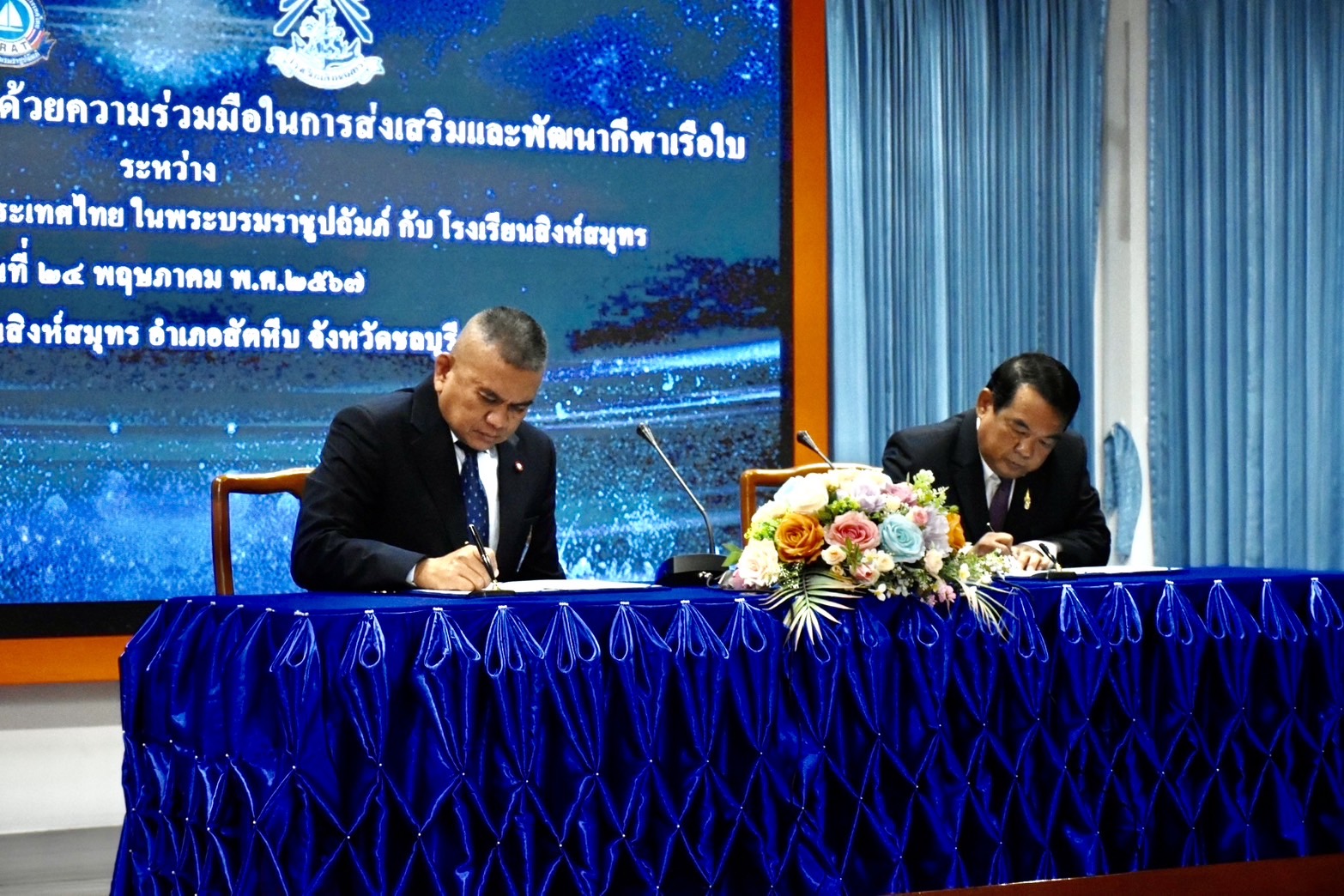 วันที่ 24 พฤษภาคม 2567 พลเรือเอก สมประสงค์ นิลสมัย นายกสมาคมกีฬาแข่งเรือใบแห่งประเทศไทย ในพระบรมราชูปถัมภ์ พร้อมด้วย นายถาวร เขียนเสมอ ผู้อำนวยการโรงเรียนสิงห์สมุทร ร่วมพิธีลงนามบันทึกความเข้าใจ (MOU) ว่าด้วยความร่วมมือในการส่งเสริมพัฒนากีฬาเรือใบ ระหว่าง สมาคมกีฬาแข่งเรือใบแห่งประเทศไทย ในพระบรมราชูปถัมภ์ กับ โรงเรียนสิงห์สมุทร ณ สรุป ห้องประชุมสิงห์สมุทรชั้น 2 อาคารอำนวยการ โรงเรียนสิงห์สมุทร จังหวัดชลบุรี โดยมี พลเรือเอก ธานี ผุดผาด