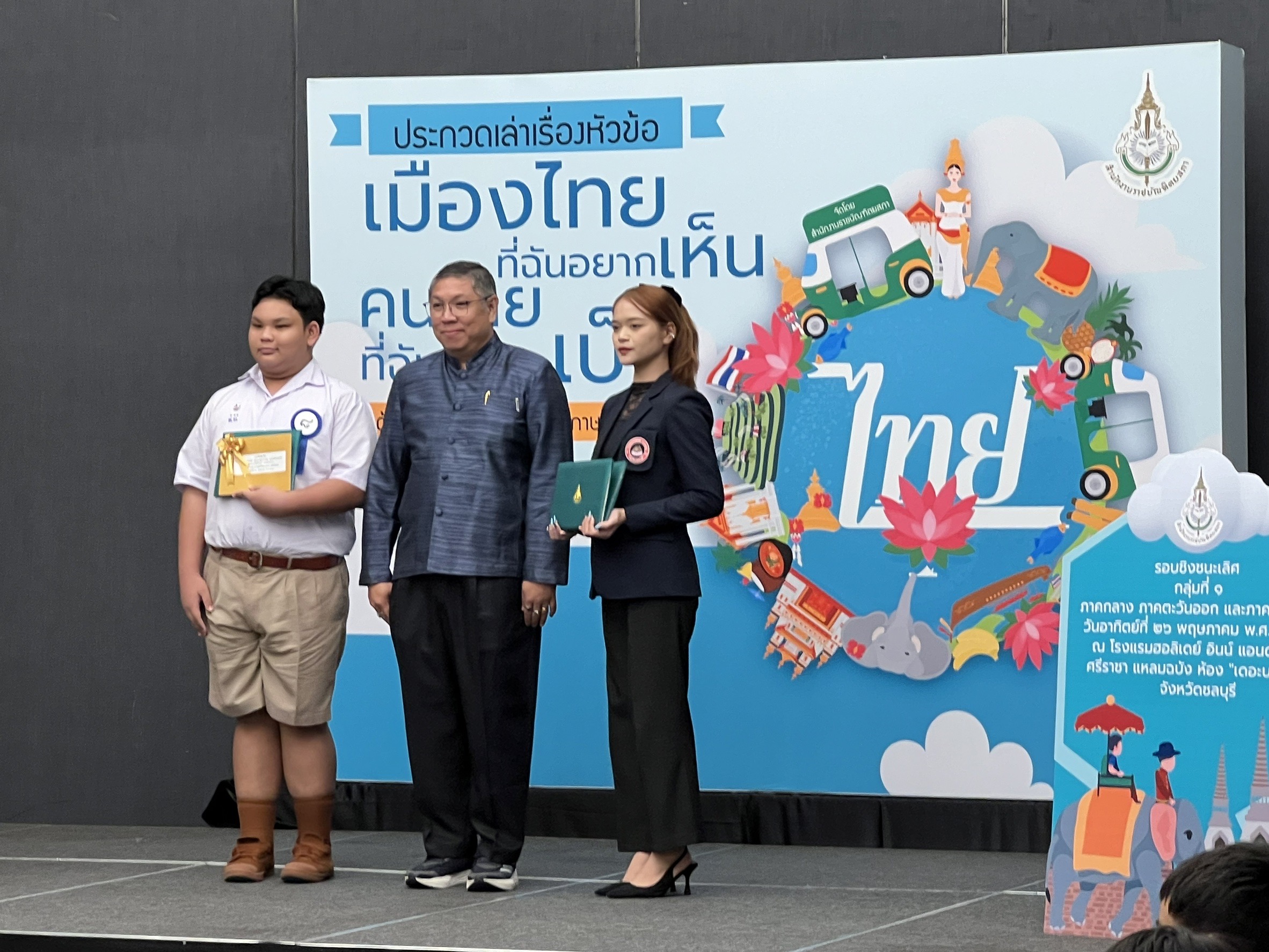 วันที่ 26 พ.ค.67 ณ โรงแรมฮอลิเดย์ อินน์ แอนด์ สวีท ศรีราชา แหลมฉบัง จ.ชลบุรี สำนักงานราชบัณฑิตยสภา จัดการประกวดเล่าเรื่องหัวข้อ “เมืองไทยที่ฉันอยากเห็น คนไทยที่ฉันอยากเป็น” โซนภาคกลาง ภาคตะวันออก และภาคตะวันตก ด้วยภาษาไทยมาตรฐานและภาษาไทยถิ่น ในโครงการ “รู้ รัก ภาษาไทย” ประจำปี 2567 รอบชิงชนะเลิศ กลุ่มที่1 โดยมีเยาวชนซึ่งเป็นนักเรียนระดับมัธยมศึกษาตอนตัน (ม.1-3) จากโรงเรียนต่าง ๆ ในภาคกลาง ภาคตะวันออก และ ภาคตะวันตก เข้าร่วมประกวด โดยได้รับเกียรติจาก นายศานติ ภักดีคำ รองเลขาธิการราชบัณฑิตยสภา เป็นประธานมอบรางวัลในการประกวด โดยมีคณะกรรมการ แขกผู้มีเกียรติ เข้าร่วมกิจกรรม