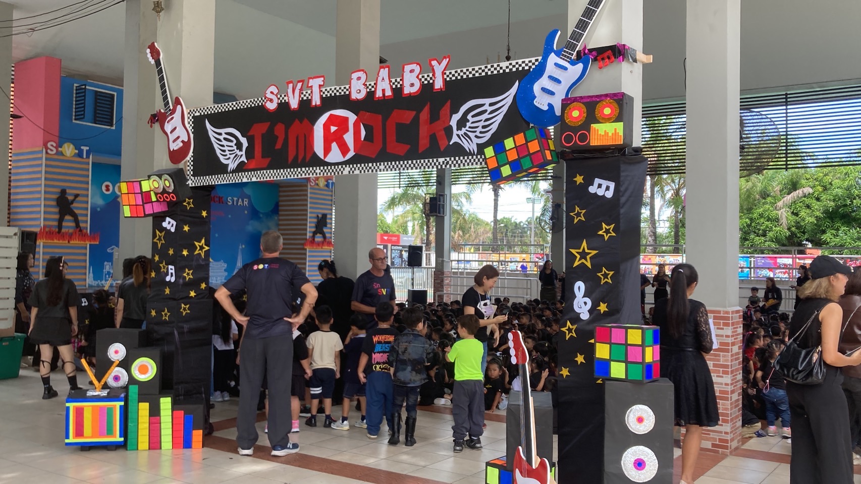 วันที่ 9 ก.ค.67 โรงเรียนศรีสุวิช จ.ชลบุรี โดย ดร.ประถมาภรณ์ ฟักฤกษ์ ผู้อำนวยการโรงเรียนฯ ครูหัวหน้าฝ่ายปฐมวัย และคณะครู ร่วมจัดกิจกรรม SVT Baby I’m Rockstar. โดยให้นักเรียนปฐมวัยระดับชั้นอนุบาล 1-3 ได้แต่งตัวในชุดชาวร็อก โทนดำ ซึ่งบรรยากาศเป็นไปอย่างน่ารักและมีสีสัน