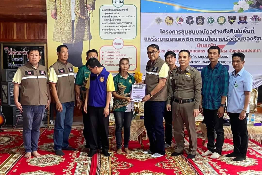 มี นายพรศักดิ์ ไชยพร ปลัดอำเภอเมืองฉะเชิงเทรา พ.ต.อ.สมชาย คงสวัสดิ์ รอง ผบก.ภ.จว.ฉะเชิงเทรา พ.ต.อ.ณัฐพล อะกะเรือน ผบก.สภ.ฉะเชิงเทรา พ.ต.ท.วันชัย ประฐม รอง ผกก.ป. พ.ต.ท.เสรี อินคง สวป. และส่วนราชการที่เกี่ยวข้องร่วมพิธี ณ ศูนย์ปฏิบัติการชุมชนยั่งยืน บ้านเดโช ต.คลองอุดมชลจร อ.เมืองฉะเชิงเทรา