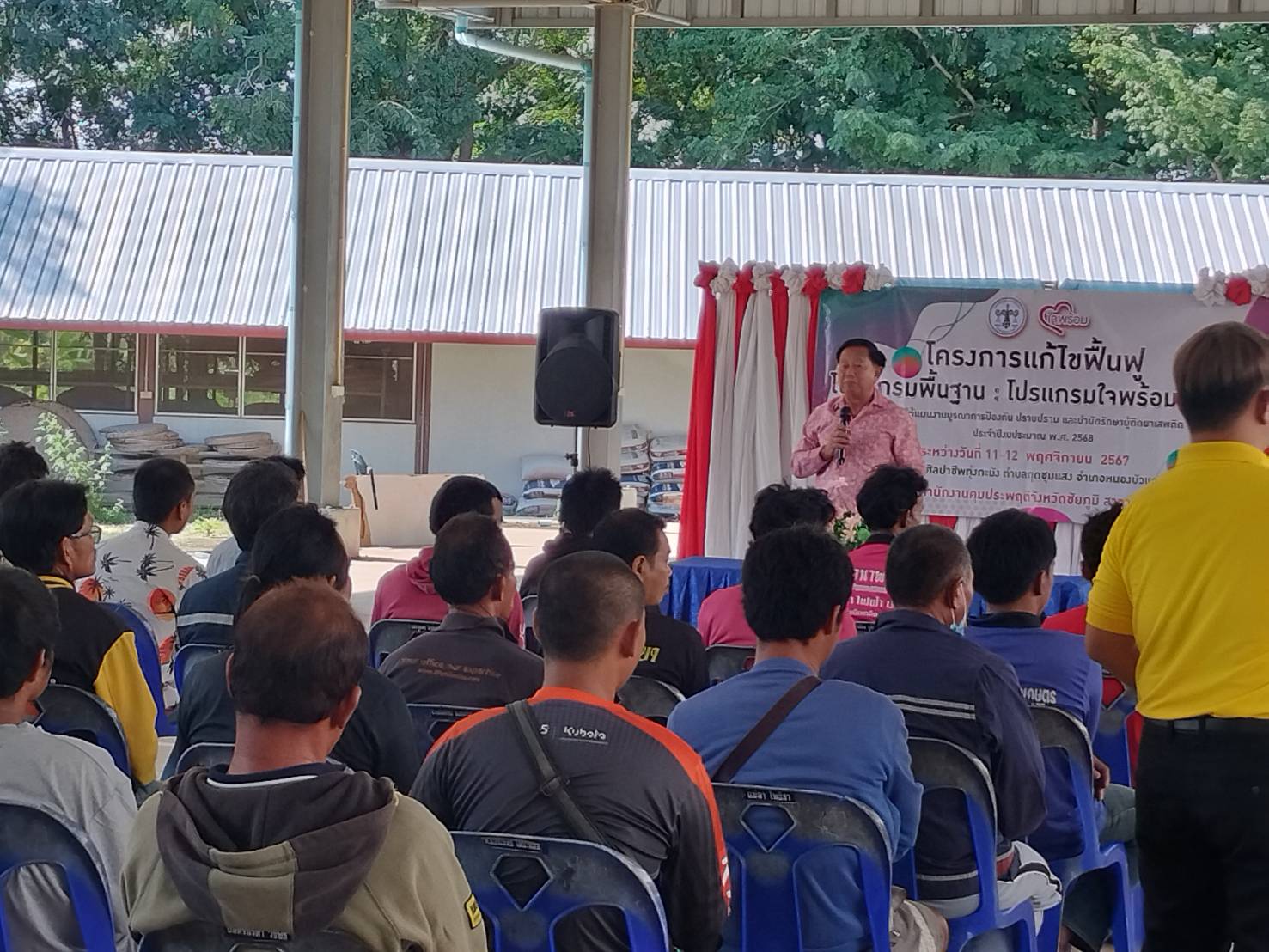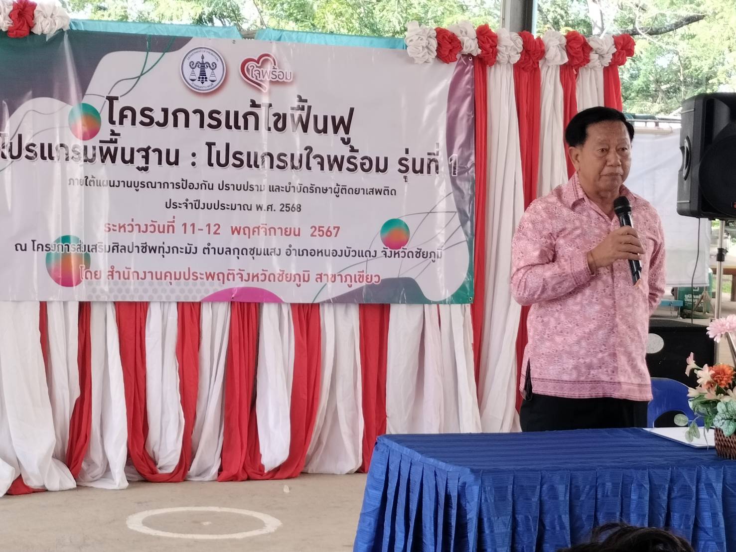 เมื่อวันที่ 11 พฤศจิกายน ที่โครงการส่งเสริมศิลปาชีพทุ่งกะมัง ตั้งอยู่บ้านหนองหอย ตำบลกุดชุมแสง อำเภอหนองบัวแดง จังหวัดชัยภูมิ นายมานะ โลหะวณิชย์ ที่ปรึกษานายภูมิธรรม เวชยชัย รองนายกรัฐมนตรี ได้เดินทางไปเป็นประธานเปิดโครงการแก้ไขฟื้นฟู โปรแกรมพื้นฐาน : โปรแกรมใจพร้อม รุ่นที่ 1 ภายใต้แผนบูรณาการป้องกัน ปราบปราม และบำบัดผู้ติดยาเสพติด ประจำปีงบประมาณ พ.ศ.2568 จัดโดยสำนักงานคุมประพฤติจังหวัดชัยภูมิ สาขาภูเขียว โดยมีผู้เข้าร่วมโครงการทั้งหมด 50 คน