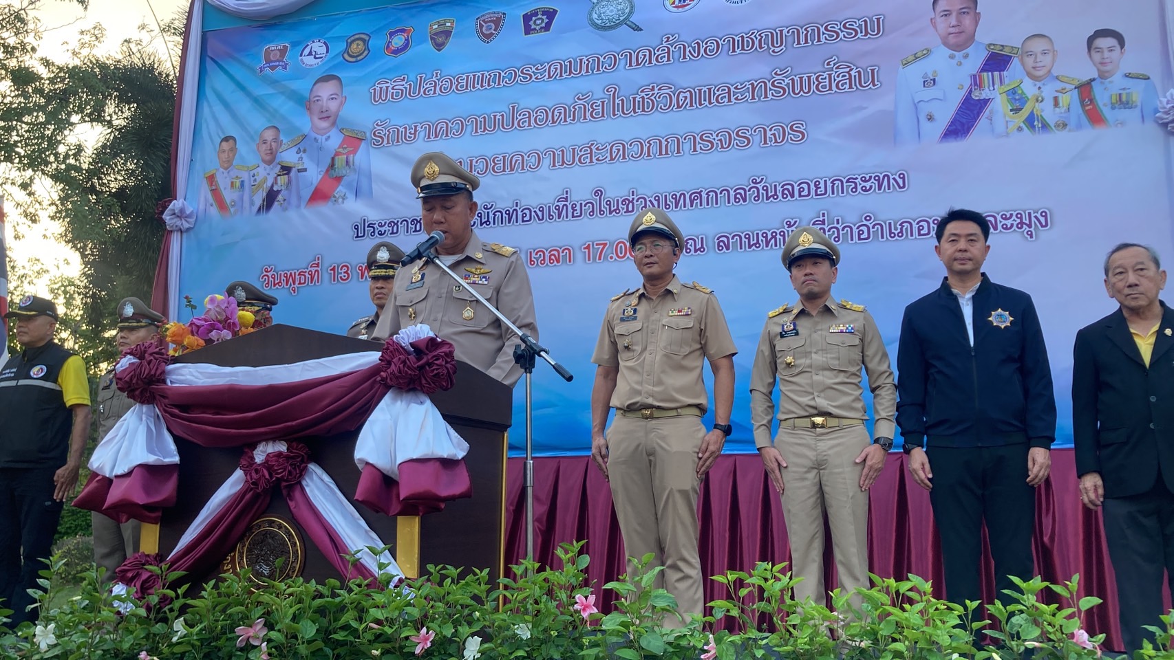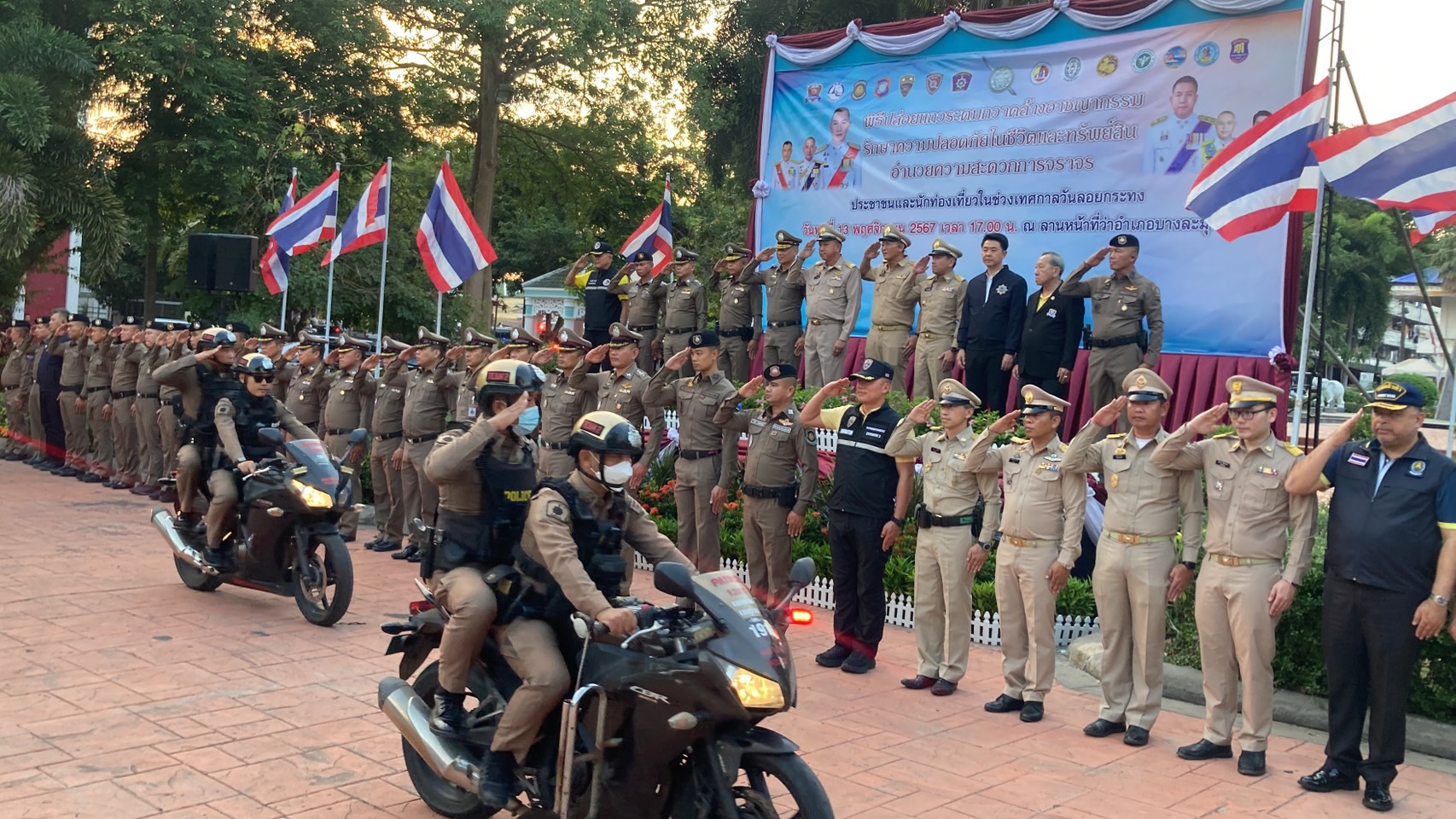 วันที่ 13 พ.ย.67 นายวีกิจ มานะโรจน์กิจ นายอำเภอบางละมุง นายปรเมศวร์ งามพิเชษฐ์ นายกเมืองพัทยา และตัวแทนหน่วยงานที่เกี่ยวข้อง ร่วมให้การต้อนรับนายธวัชชัย ศรีทอง ผู้ว่าราชการจังหวัดชลบุรี ในโอกาสเดินทางมาเป็นประธานในพิธีปล่อยแถวระดมกวาดล้างอาชญากรรมรักษาความปลอดภัยในชีวิตและทรัพย์สิน อำนวยความสะดวกการจราจร ประชาชน และนักท่องเที่ยวในช่วงเทศกาลวันลอยกระทง ประจำปี 2567 ที่จัดขึ้นที่บริเวณลานอเนกประสงค์ ที่ว่าการอำเภอบางละมุง จ.ชลบุรี