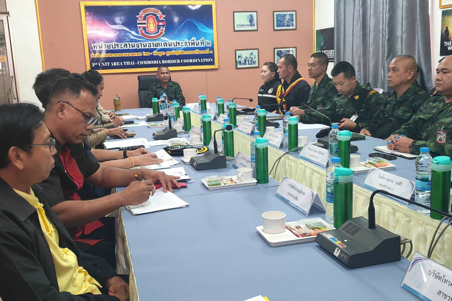 วันที่ 5 ก.พ.68 ที่ศูนย์ประสานงานพื้นที่ชายแดน ด่านช่องจอม อำเภอกาบลเชิง จังหวัดสุรินทร์ พันเอกบุญเสริม บุญบำรุง รองผู้บัญชาการกองกำลังสุรนารี เป็นประธานประชุมร่วมกับหน่วยงานฝ่ายมั่นคงต่างๆ โดยมีนายสุทธิโรจน์ เจริญธนะศักดิ์ นายอำเภอกาบเชิง,พ.ต.อ. คำพล โนนุช ผกก.สภ.กาบเชิง,รมน.จังหวัดสุรินทร์ โทรมนาคม หรือ กสทช.,การไฟฟ้าภูมิภาคอำเภอปราสาท ตำรวจตรวจคนเข้าเมืองจังหวัดสุรินทร์ ด่านศุลกากร องค์การบริหารส่วนตำบลกาบเชิง และหน่วยงานที่เกี่ยว เข้าร่วมวางมาตรการในครั้งนี้ เนื่องด้วยปัจจุบัน ปัญหาการหลอกลวงประชาชนให้ไปทำงานในต่างประเทศโดยไม่ชอบด้วยกฎหมาย ได้มีแนวโน้มเพิ่มขึ้นอย่างต่อเนื่อง โดยเฉพาะการใช้ประเทศไทยเป็นทางผ่านในการส่งแรงงานไปยังประเทศที่ 3 รวมถึงปัญหาอาชญากรรมทางเทคโนโลยี “แก๊งคอลเซ็นเตอร์” ที่มีการหลอกลวงคนไทยหรือชาวต่างชาติไปทำงาน โดยผ่านช่องทางตรวจคนเข้าเมือง หรือช่องทางธรรมชาติ ซึ่งส่งผลกระทบต่อภาพลักษณ์ของประเทศ และก่อให้เกิดความเสียหายต่อชีวิตและทรัพย์สินของผู้เสียหายเป็นวงกว้าง