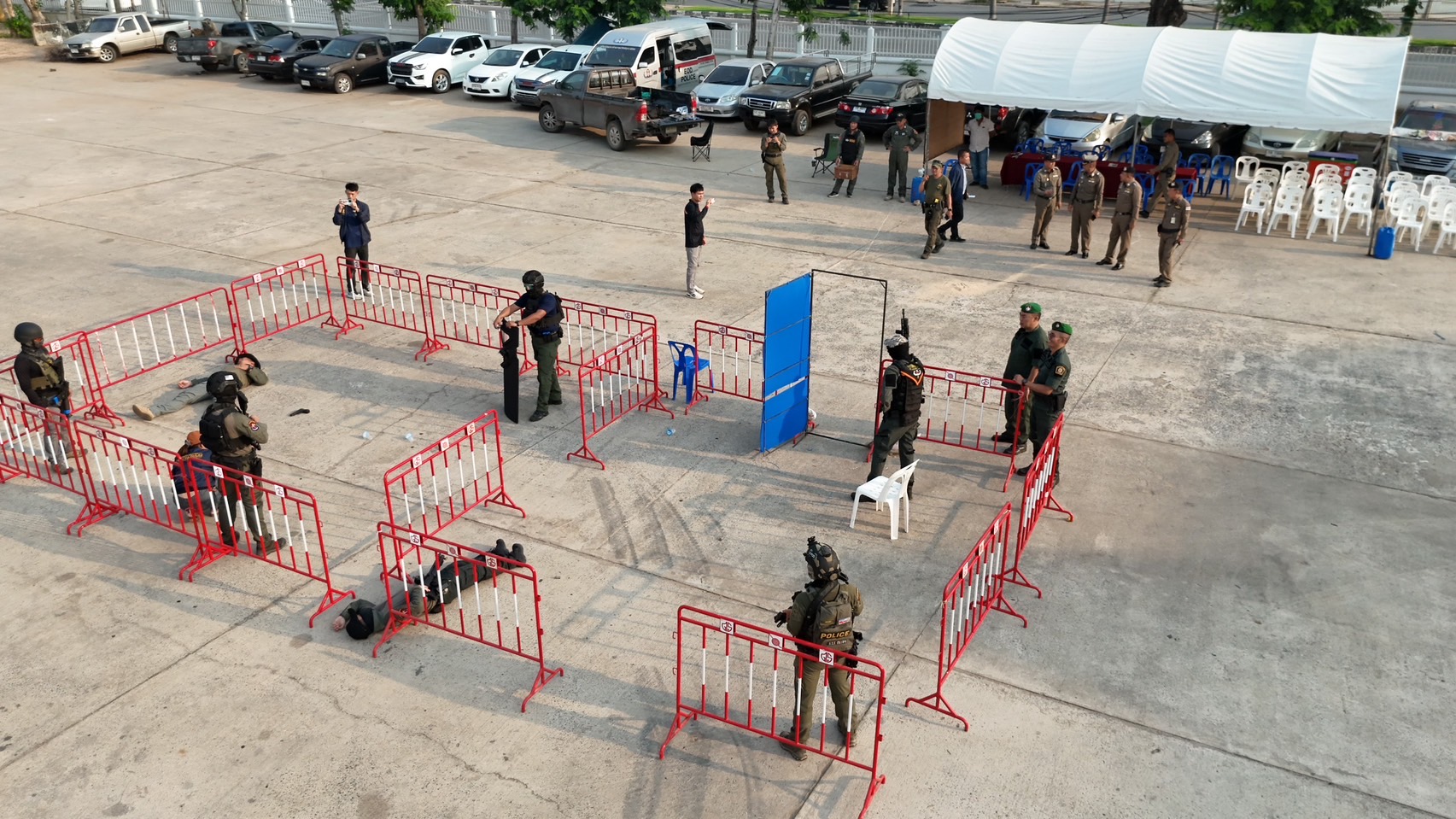 ที่ ลานเอกประสงค์ภูธรจังหวัดชัยภูมิ พล.ต.ต.สุจริต ปานเล็ก ผบก.ภ.จว.ชัยภูมิ พร้อมด้วย พ.ต.อ.อานุภาพ ผิวอ่อน รอง ผบก.ภ.จว.ชัยภูมิ พ.ต.อ.ประสิทธิ์ เปรมกมล ผกก.สภ.เมืองชัยภูมิ นำกำลังพลบูรณาการร่วมกับฝ่ายปกครอง จนท.อส. เทศกิจ หน่วยกู้ชีพ รพ.ชัยภูมิ มูลนิธิสว่างคุณธรรม และหน่วยงานที่เกี่ยวข้อง จัดการฝึกซ้อมยุทธวิธีกำลังพล