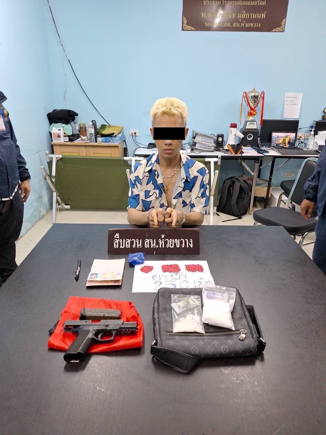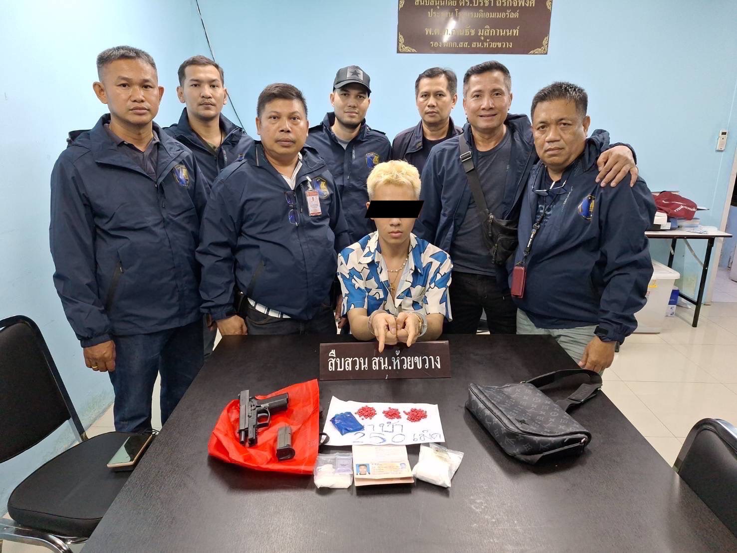 พ.ต.ท.ชนภัทร สุขสวัสดิ์ สว.สส. และฝ่ายสืบสวน สน.ห้วยขวาง ร่วมกันจับกุม นายฉี ปิ่งถวน อายุ 27 ปี สัญชาติจีน พร้อมของกลางยาเสพติดให้โทษประเภท 1 (ยาไอซ์) ชนิดเกล็ดสีขาวขุ่น บรรจุอยู่ในถุงพลาสติกใสแบบรูดเปิด-กดปิด น้ำหนัก 23.80 กรัม ซุกซ่อนอยู่ในกระเป๋าสะพายข้างยาบ้าชนิดเม็ดสีส้ม จำนวน 250 เม็ด ยาเคน้ำหนัก 90.35 กรัม อาวุธปืนชนิดกึ่งออโตเมติก สีดำ (ไทยประดิษฐ์) ขนาด 9 มม. จำนวน 1 กระบอก พร้อมซองบรรจุกระสุน แม็กกาซีนจำนวน 1 อัน ซุกซ่อนอยู่บนช่องหลังคา รถยนต์ ยี่ห้อโตโยต้า รุ่นอัลพาด สีดำ