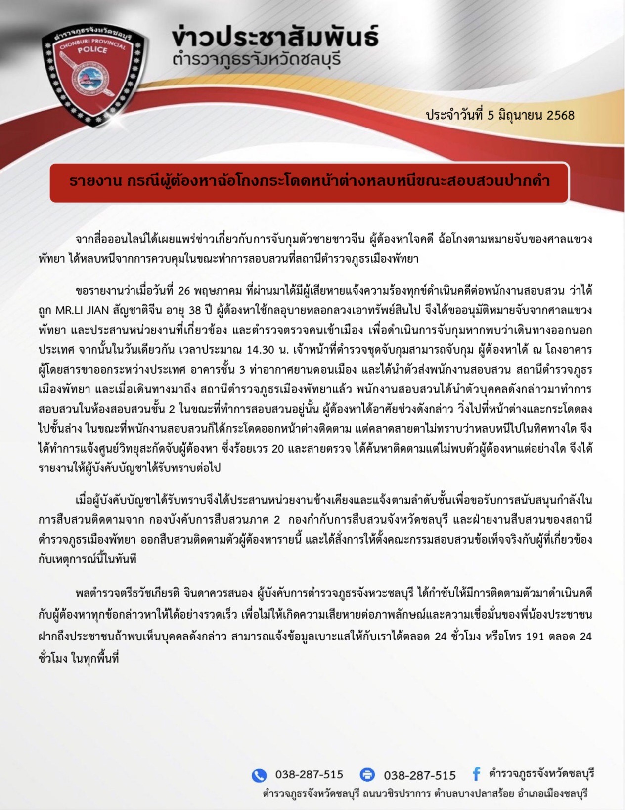 ล่าสุดวันที่ 5 มิ.ย.68 ตำรวจภูธรจังหวัดชลบุรี ได้มีหนังสือประชาสัมพันธ์รายงานชี้แจงเกี่ยวกับกรณีดังกล่าว โดยรายงานว่า