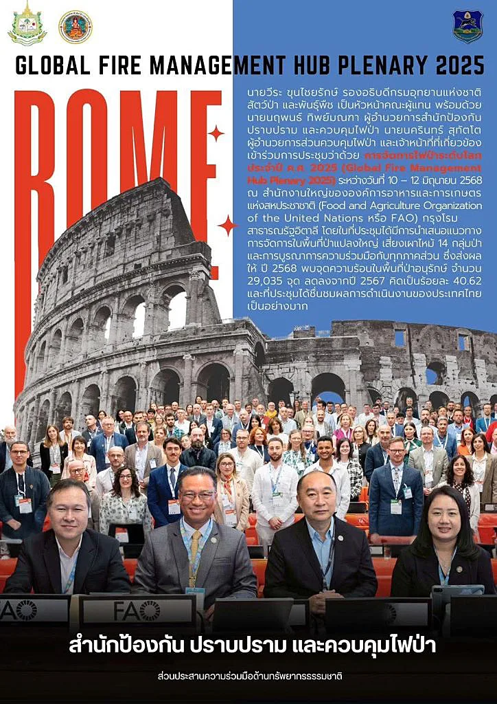 กรุงโรม, อิตาลี – นายวีระ ขุนไชยรักษ์ รองอธิบดีกรมอุทยานแห่งชาติ สัตว์ป่า และพันธุ์พืช นำคณะผู้แทนประเทศไทยเข้าร่วมการประชุม “การจัดการไฟป่าระดับโลก ประจำปี 2025” (Global Fire Management Hub Plenary 2025) ระหว่างวันที่ 10–12 มิถุนายน 2568 ณ สำนักงานใหญ่องค์การอาหารและการเกษตรแห่งสหประชาชาติ (FAO) กรุงโรม สาธารณรัฐอิตาลี