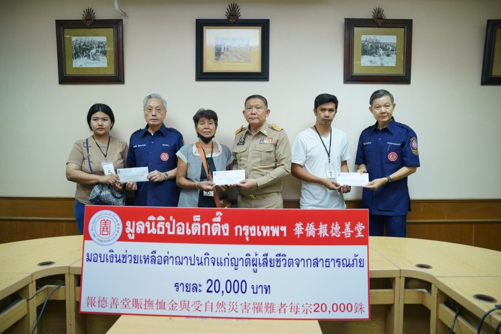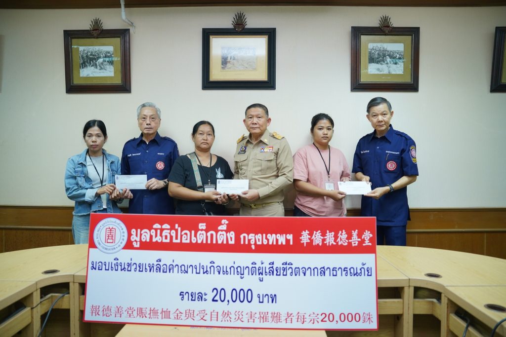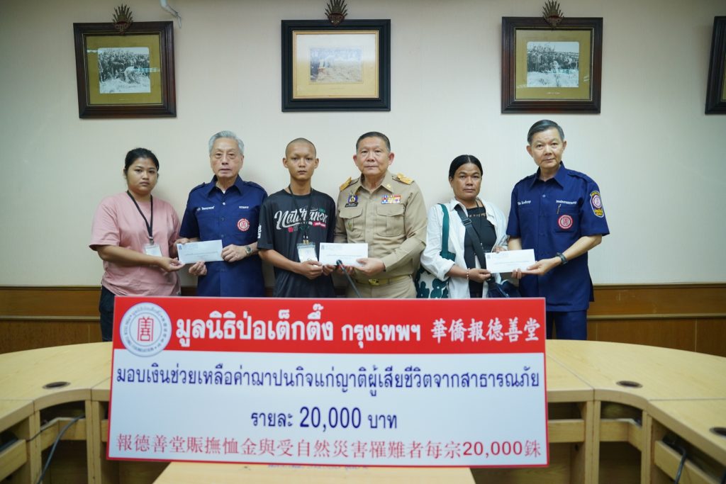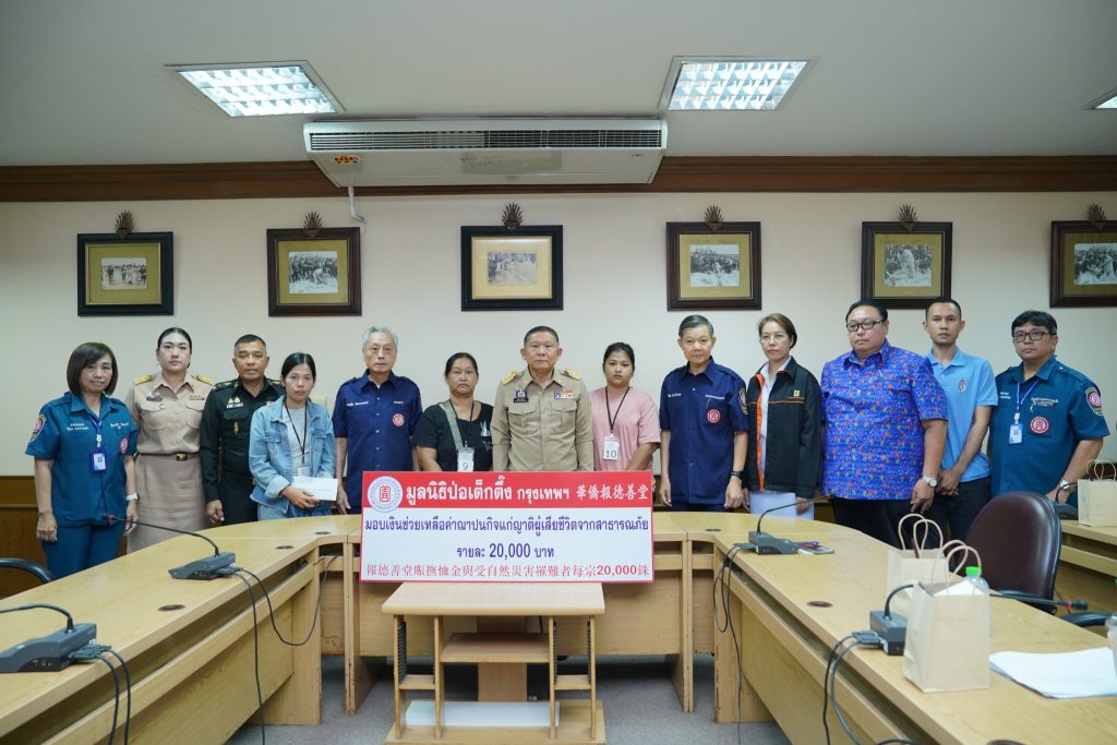 วันศุกร์ที่ 8 สิงหาคม พ.ศ. 2568) มูลนิธิป่อเต็กตึ๊ง นำโดย นายวิชิต ชินวงศ์วรกุล รองประธานกรรมการ พร้อมด้วย นายชาญกิจ วิทยาวรากรณ์ กรรมการ นำทีมแผนกสาธารณภัย ฝ่ายสังคมสงเคราะห์ นำโดย นางศิริพร กระจ่างหล้า ผู้จัดการฝ่ายสังคมสงเคราะห์ และ นายรัชพร ประสงค์ทรัพย์ หัวหน้าแผนกสาธารณภัย เข้าเยี่ยมเยียนพร้อมให้กำลังใจแก่ผู้บาดเจ็บและญาติผู้เสียชีวิตจากเหตุโรงงานพลุระเบิด ตำบลบ้านโพธิ์ อำเภอเมือง จังหวัดสุพรรณบุรี โดยมอบเงินปลอบขวัญจำนวน 1 รายๆ ละ 5,000 บาท และมอบเงินช่วยเหลือค่าฌาปนกิจแก่ครอบครัวผู้เสียชีวิต รวม 9 รายๆ ละ 20,000 บาท รวมงบประมาณการช่วยเหลือทั้งสิ้น 185,000 บาท (หนึ่งแสนแปดหมื่นห้าพันบาทถ้วน) โดยมี นายพิริยะ ฉันทดิลก ผู้ว่าราชการจังหวัดสุพรรณบุรี เป็นประธานในพิธี ณ ศาลากลางจังหวัดสุพรรณบุรี อำเภอเมือง จังหวัดสุพรรณบุรี