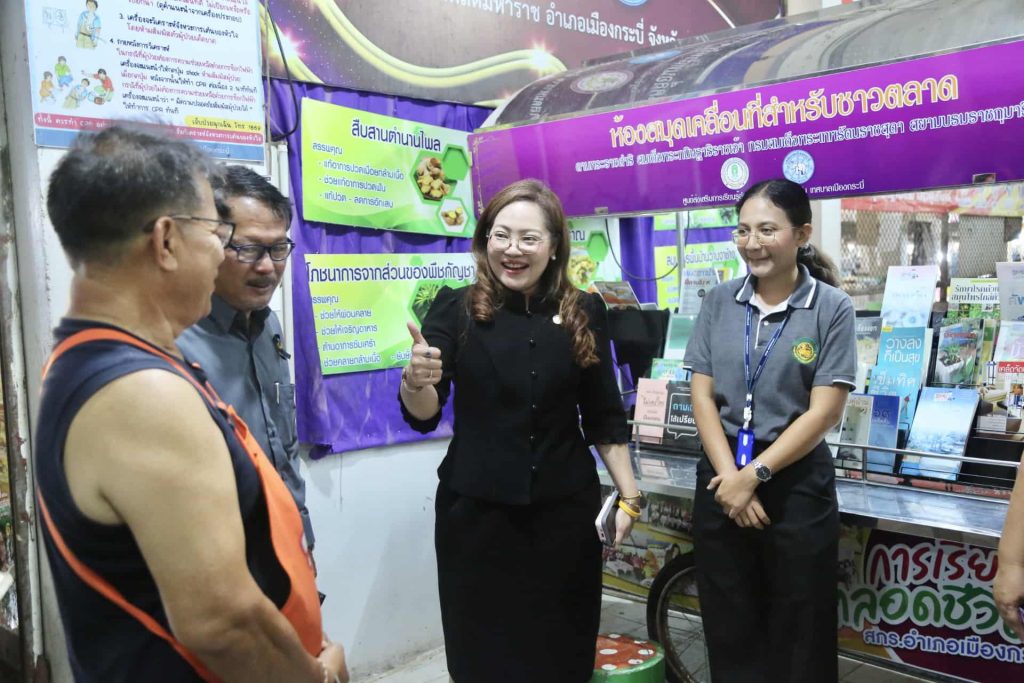 ดร.เกศทิพย์ ศุภวานิช อธิบดีกรมส่งเสริมการเรียนรู้ (สกร.) เยี่ยมให้กำลังใจเจ้าหน้าที่และอาสาสมัครประจำ “ห้องสมุดเคลื่อนที่สำหรับชาวตลาด” ณ ตลาดสดมหาราช ตำบลปากน้ำ อำเภอเมือง จังหวัดกระบี่ ซึ่งเปิดให้บริการตั้งแต่วันที่ 2 เมษายน 2560 ตามพระราชดำริของ สมเด็จพระกนิษฐาธิราชเจ้า กรมสมเด็จพระเทพรัตนราชสุดาฯ สยามบรมราชกุมารี เพื่อให้ประชาชนได้มีโอกาสเข้าถึงแหล่งความรู้ได้อย่างสะดวกในชีวิตประจำวัน