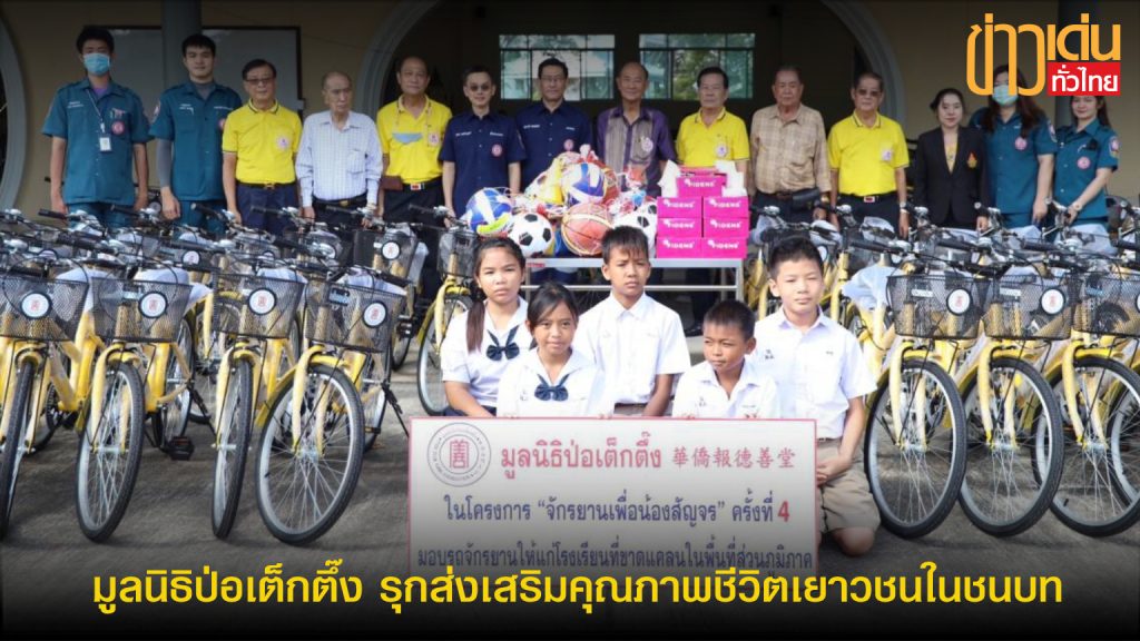 “มูลนิธิป่อเต็กตึ๊ง” รุกส่งเสริมคุณภาพชีวิตเยาวชนในชนบทอย่างยั่งยืนต่อเนื่อง จัดงบประมาณโครงการจักรยานเพื่อน้องสัญจร ครั้งที่ 4 กว่า 2.5 ล้านบาท มอบจักรยาน หน้ากากอนามัย อุปกรณ์กีฬา และค่าพาหนะแก่โรงเรียนรวม 75 แห่ง ในช่วงระหว่างวันที่ 15 พฤศจิกายน – 21 ธันวาคม 2566 มูลนิธิป่อเต็กตึ๊ง โดย นายวิเชียร เตชะไพบูลย์ ประธานกรรมการมูลนิธิฯ ห่วงใยเยาวชนในถิ่นทุรกันดาร มอบหมายให้ นายสุรพงศ์ เสรฐภักดี กรรมการและรองเหรัญญิก พร้อมด้วย นายชูเดช เตชะไพบูลย์ ผู้ช่วยกรรมการมูลนิธิฯ และนางศิริพร กระจ่างหล้า ผู้จัดการฝ่ายสังคมสงเคราะห์ นำทีมแผนกส่งเสริมการศึกษาและอาชีพ ฝ่ายสังคมสงเคราะห์ ลงพื้นที่โรงเรียนชนบทที่มีนักเรียนประสบปัญหาในการเดินทางมาโรงเรียน