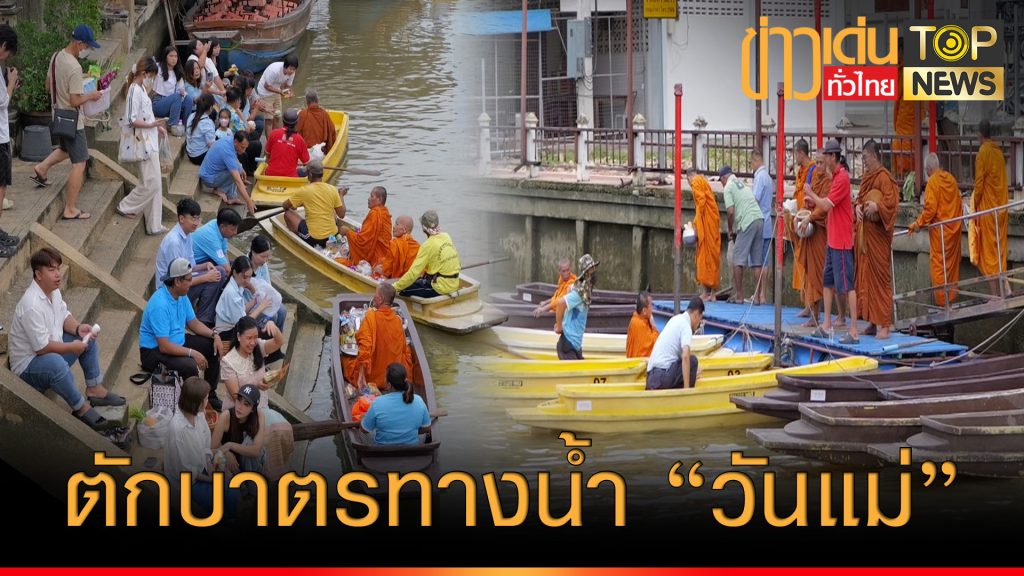 สมุทรสงครามนักท่องเที่ยวร่วมตักบาตรพระทางน้ำวันแม่กันอย่างคึกคัก