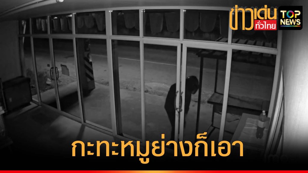 วงจรปิดจับภาพ โจรแสบสวมเสื้อแจ็คเก็ตพร้อมหมวกกันน็อก ใช้คีมตัดโซ่งัดร้านขายของชำ ฉกเตาแก๊สปิกนิกพร้อมกะทะหมูย่างก่อนหลบหนีไป