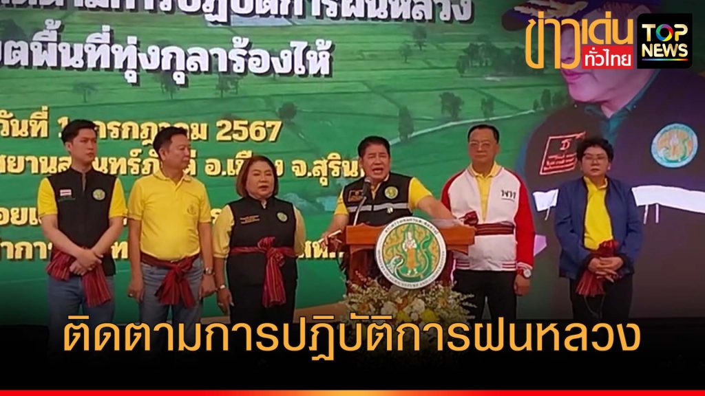 วันที่ 1 กรกฎาคม 2567 ร้อยเอก ธรรมนัส พรหมเผ่า รัฐมนตรีว่าการกระทรวงเกษตรและสหกรณ์ ลงพื้นที่ตรวจติดตามการปฏิบัติการฝนหลวงในเขตพื้นที่ทุ่งกุลาร้องไห้ โดยมี นายสุพิศ พิทักษ์ธรรม อธิบดีกรมฝนหลวงและการบินเกษตร พร้อมด้วยหน่วยงานในสังกัดกระทรวงเกษตรและสหกรณ์ในพื้นที่ให้การต้อนรับ โดยรัฐมนตรีว่าการกระทรวงเกษตรและสหกรณ์ ได้รับฟังรายงานการปฏิบัติการฝนหลวงในเขตพื้นที่ทุ่งกุลาร้องไห้ในช่วงที่ผ่านมา พร้อมมอบนโยบายแนวทางการปฏิบัติงานเพื่อช่วยบรรเทาปัญหาฝนทิ้งช่วง และให้กำลังใจเจ้าหน้าที่กรมฝนหลวงและการบินเกษตร ในการปฏิบัติภารกิจให้เกิดความสำเร็จลุล่วงไปได้ด้วยดี รวมถึงพบกับผู้แทนเกษตรกร ผู้แทนผู้ประกอบการค้าข้าว เพื่อการรับฟังปัญหาอุปสรรคในด้านการบริหารจัดการทรัพยากรน้ำ และนำมาใช้เป็นแนวทางในการวางมาตรการให้ความช่วยเหลือจากกระทรวงเกษตรและสหกรณ์ จากนั้นได้มอบเมล็ดข้าวพันธุ์ดีให้แก่ผู้แทนเกษตรกร สำหรับนำไปแจกจ่ายให้แก่เกษตรกรที่ยังไม่สามารถหว่านข้าวได้ในช่วงที่ผ่านมา เนื่องจากพื้นที่นั้นมีสภาพแห้งแล้งเกินไป รวมถึงเกษตรกรที่ประสบปัญหาภัยแล้งจนได้รับความเสียหายจากการหว่านข้าวในรอบแรก และมอบโฉนด เพื่อการเกษตร ให้แก่ผู้แทนเกษตรกร จำนวน 100 ราย เพื่อนำไปใช้ประโยชน์เฉพาะการเกษตรในการพัฒนา ต่อยอด ให้เกิดการสร้างอาชีพ สร้างรายได้ และความมั่นคงในชีวิต