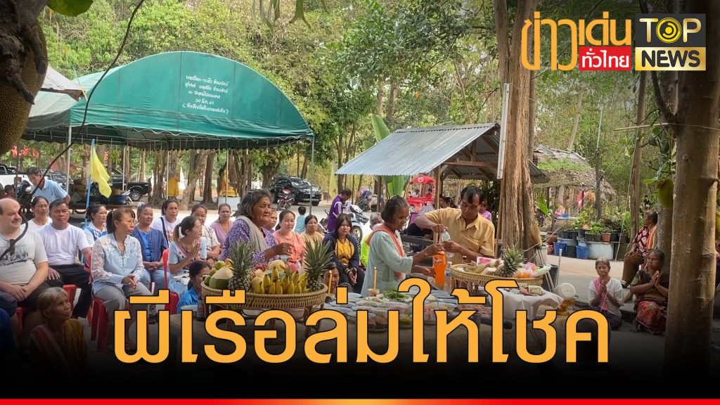 ผู้สื่อข่าวรายงานว่า เมื่อวันที่ 24 มี.ค. 2567 ที่บริเวณวัดเทพไชยมงคล หรือวัดบ้านขยอง หรือวัดผีเรือล่ม ต.ตาตุม อ.สังขะ จ.สุรินทร์ ได้มีชาวบ้านประมาณ 100 คน ได้นำเครื่องเซ่นไหว้ อาหารคาวหวานและผลไม้ พร้อมกับนิมนต์พระมาทำพิธีสวดส่งวิญญาณคนตาย เพื่อให้ไปสู่ภพที่ดี ในวันครบรอบ 5 ปี ที่พบซากเรือมรณะ