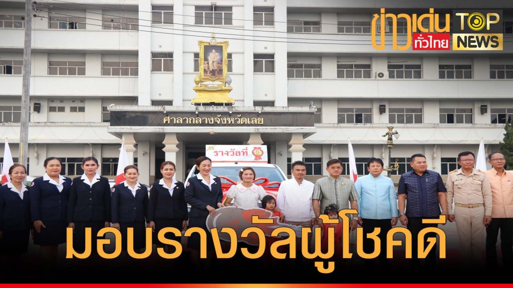วันที่ 1 มีค. 2567 ที่สนามหน้าศาลากลางจังหสัดเลย นายชัยพจน์ จรูญพงศ์ ผู้ว่าราชการจังหวัดเลย เป็นประธานมอบรางวัลสลากกาชาดดอกฝ้ายบาน สืบสานวัฒนธรรมไทเลย ประจำปี 2567 แก่ผู้โชคดีเจ้าของสลากรางวัลกาชาด รางวัลที่ 1 รถยนต์บรรทุกดีเซล ขับเคลื่อน 2 ล้อ ยี่ห้อ Mitsubishi All New Triton Double Cab จำนวน 1 รางวัล หมายเลขสลากที่ถูก 025252 นางจุฑาทิพย์ ศรีคำ ตำบลนาพึง อำเภอนาแห้ว จังหวัดเลย