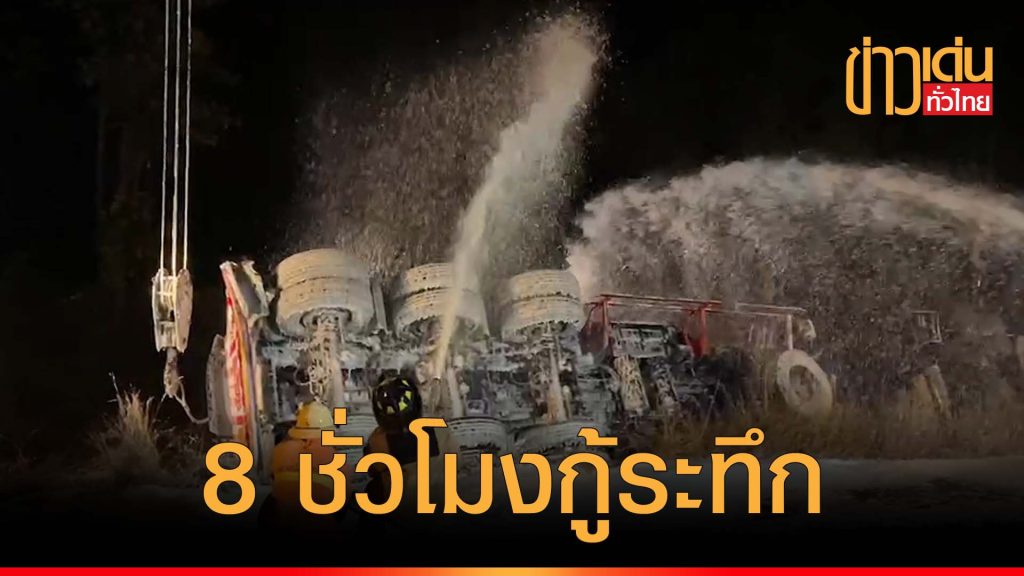 กู้ระทึก จนท.ฉีดโฟมเลี้ยงป้องกันประกายไฟ ขณะใช้เครน 2 คันยกรถบรรทุกน้ำมัน 4 หมื่นลิตรที่พลิกคว่ำ บนเส้นทางหมาย 24 ใช้เวลากว่า 8 ช.ม.จึงสำเร็จ