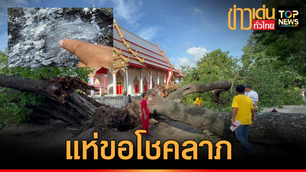 ชาวบ้านแห่นำแป้งไปทาต้นโพธิ์ อายุกว่า 200 ปี ขอโชคลาภ หลัง หักโค่น เป็น 3 เสี่ยง บริเวณหน้าโบสถ์ ชาวบ้านเชื่อปาฏิหาริย์หลวงพ่อช่วงแหวกต้นโพธิ์ออกเป็น3เสี่ยงหลักหักโค่นเพื่อไม่ให้โดนโบสถ์ได้รับความเสียหาย