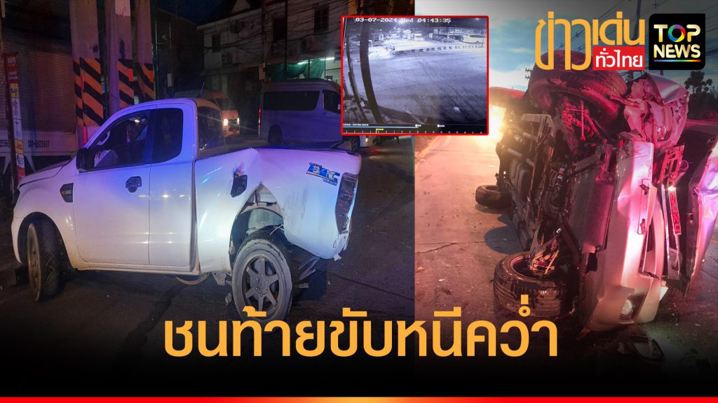 ดังสนั่น ! รถกระบะถูกชนท้ายพุ่งข้ามเลนชนแท่นบาริเออร์ก่อนจะชนเสาไฟฟ้าข้างทาง ส่วนคันชนท้ายพลิกคว่ำอีกคัน