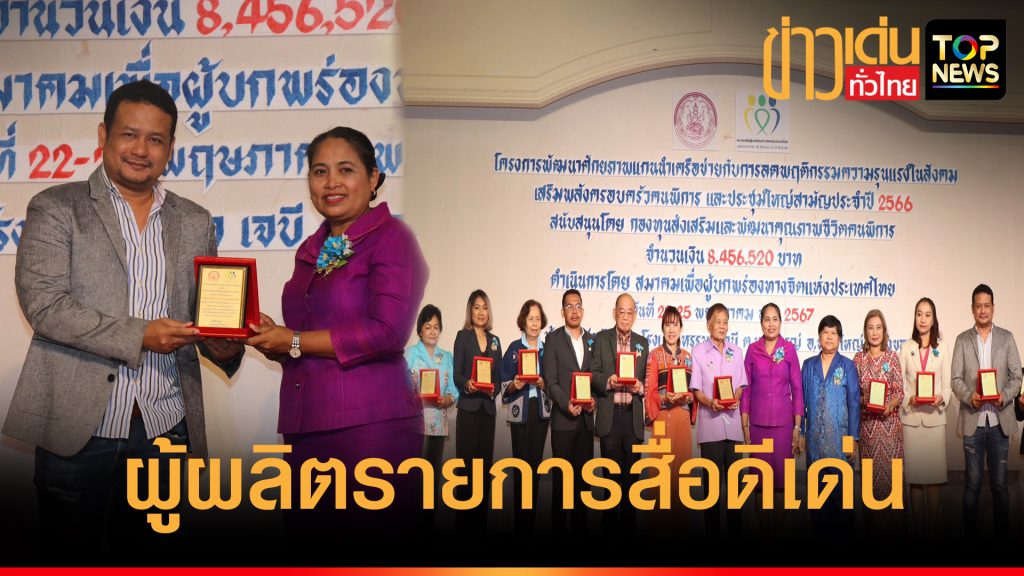 เมื่อวันพฤหัสบดี ที่ 23 พฤษภาคม 2567 ที่ผ่านมา ณ.ห้องประชุมโรงแรมหรรษา เจบี ถ.จุติอนุสรณ์ ต.หาดใหญ่ อ.หาดใหญ่ จ.สงขลาคุณ โกสินธ์ จินาอ่อนบรรรณาธิการข่าว รายการเปิดฟ้า ช่อง 5 (ช่วงคนละไม้คนละมือ)เข้ารับรางวัลผู้ผลิตรายการสื่อดีเด่นที่ช่วยเหลือผู้อยู่ในภาวะยากลําบากด้วยสมาคมเพื่อผู้บกพร่องทางจิตแห่งประเทศไทย ได้รับงบสนับสนุนจากกรมส่งเสริมและพัฒนาคุณภาพ ชีวิตคนพิการ ให้จัดทําโครงการพัฒนาศักยภาพแกนนําเครือข่ายกับการลดพฤติกรรมความรุนแรงในสังคม เสริมพลังครอบครัวคนพิการด้านการส่งเสริมอาชีพ รวมทั้งเสริมพลังองค์กรเครือข่ายให้เข้มแข็ง และประชุมใหญ่ สามัญ ประจําปี 2566 โดยมี มีกลุ่มเป้าหมายประกอบด้วย คณะกรรมการบริหารสมาคมฯ ที่ปรึกษาสมาคมฯ กรรมการเครือข่ายภาค/เขต คนพิการทางจิตและผู้ดูแล แกนนําชมรมเครือข่าย วิทยากรและเจ้าหน้าที่ รวมจํานวน 1,940 คน คุณนุชจารี คล้ายสุวรรณ” นายกสมาคมเพื่อผู้บกพร่องทางจิตแห่งประเทศ(กล่าวว่า)โดยมีมติที่ประชุมคณะกรรมการบริหารสมาคมฯ ครั้งที่ 7