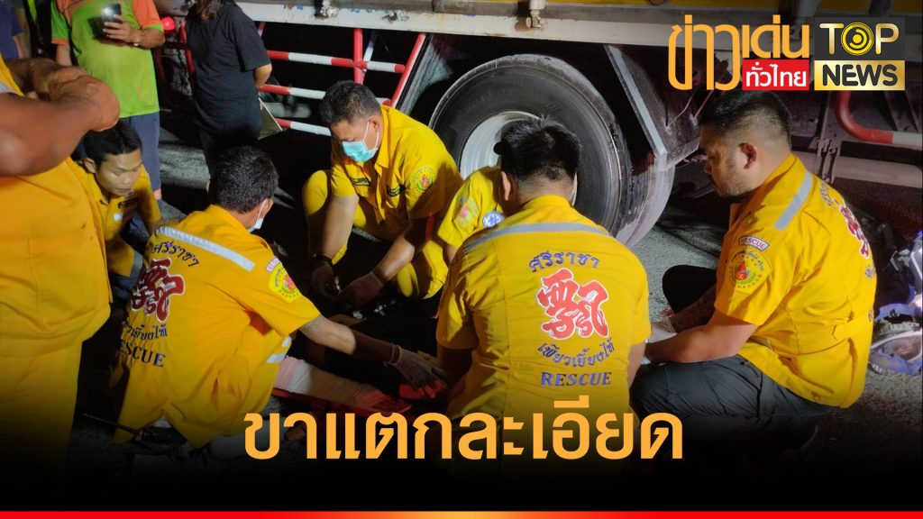 ระทึก หนุ่มขี่จยย.มาด้วยความเร็วสูง พุ่งมุดเข้าใต้ท้อง รถ 6 ล้อ ถูกเหยียบขาแตกละเอียด