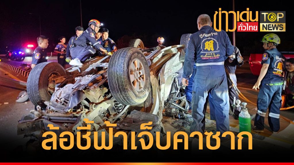 พันจ่าทหารเรือ ขับกระบะเสียหลักชนเสาไฟกลางถนน หงายท้องล้อชี้ฟ้า ติดคารถสาหัส