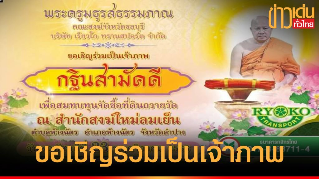 พระครูมธุรสธรรมภาณ(หลวงพ่อน้ำหอม) เจ้าอาวาสวัดรังษีสุทธาวาส(ไร่กล้วย) รองเจ้าคณะอำเภอศรีราชา รูปที่ 2 ประธานสภาสงฆ์ชลบุรี ขอเรียนเชิญพุทธศาสนิกชนชาวพุทธผู้ใจบุญ ร่วมเป็นเจ้าภาพทำบุญซื้อที่ดินถวายวัด ทอดกฐินสามัคคีทอดถวาย ณ สำนักสงฆ์ใหม่ลมเย็น ( ศูนย์ปฏิบัติธรรมสาขาวัดรังษีสุทธาวาส ) ตำบลห้างฉัตร อำเภอห้างฉัตร จังหวัดลำปาง ในวันพฤหัสบดีที่ 23 พฤศจิกายน พุทธศักราช 2566 เวลา09.00น. แห่องค์กฐินและทอดกฐิน โดยมีพระครูมธุรสธรรมภาณ(หลวงพ่อน้ำหอม )เจ้าอาวาสวัดรังษีสุทธาวาส รองเจ้าคณะอำเภอศรีราชา รูปที่ 2 ประธานสภาสงฆ์ชลบุรี เป็นประธานดำเนินงาน ในครั้งนี้โดยขอเชิญพุทธศาสนิกชนชาวพุทธผู้ใจบุญ ร่วมเป็นเจ้าภาพกองบุญละ 1,000 บาท หรือตามกำลังศรัทธา โดยสามารถทำบุญออนไลน์ได้ที่ บัญชีธนาคารกสิกรไทย เลขที่ 017-8-88711-4 หรือสอบถามข้อมูลเพิ่มเติมได้ที่ พระครูสังฆรักษ์ชัยโย ติกฺขปญฺโญ (หัวหน้าสำนักสงฆ์ใหม่ลมเย็น) ได้ที่เบอร์โทร. 062 247 3198