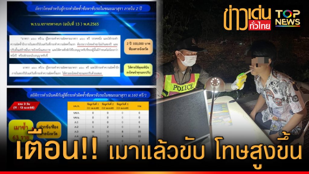 ศูนย์บริหารงานจราจร สำนักงานตำรวจแห่ง เตือนเข้ม เมาแล้วขับตรวจพบถูกจับซ้ำ ต้องรับโทษสูงขึ้น