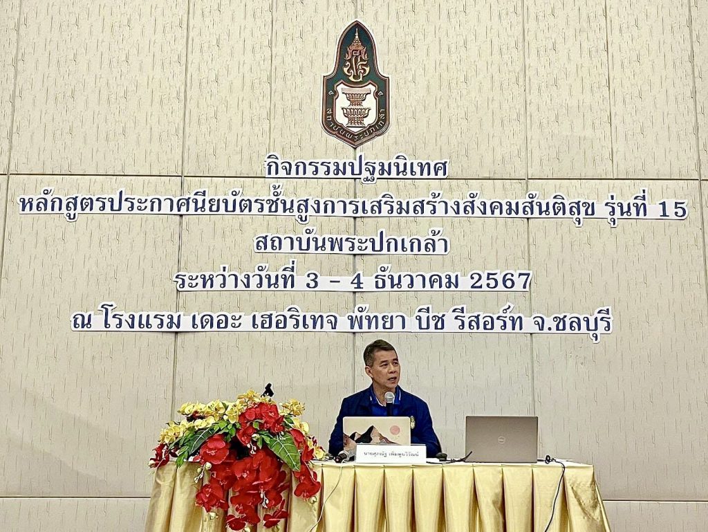 วันที่ 4 ธันวาคม 2567 ที่โรงแรมเดอะเฮอริเทจ พัทยา บีช รีสอร์ทสำนักสันติวิธีและธรรมาภิบาล สถาบันพระปกเกล้า นำคณะนักศึกษาหลักสูตรประกาศนียบัตรชั้นสูงการเสริมสร้างสังคมสันติสุข รุ่นที่ 15 ร่วมทำกิจกรรม “เสริมสร้างความเป็นพลเมือง” โดยอาจารย์กู้เกียรติ ภูมิรัตน์ ที่ปรึกษาเลขาธิการสถาบันพระปกเกล้า ด้านการส่งเสริมการเมืองภาคพลเมือง และคณะ ซึ่งเป็นกิจกรรมที่ให้ความรู้สำนึกความเป็นพลเมือง พร้อมทั้งการทำความรู้จักกัน ทำกิจกรรมและแลกเปลี่ยนเรียนรู้ร่วมกัน นอกจากนี้ได้รับเกียรติจาก นายวิทวัส ชัยภาคภูมิ เลขาธิการสถาบันพระปกเกล้า ร่วมสังเกตุการณ์ในกิจกรรมอบรมปฐมนิเทศดังกล่าวด้วย ทั้งนี้ ดร.ชิงชัย หาญเจนลักษณ์ ประธานคณะกรรมการอำนวยการหลักสูตรฯ ให้เกียรติบรรยายหัวข้อ “ความคาดหวังของหลักสูตรต่อการขับเคลื่อนประเด็นสาธารณะเพื่อสร้างสังคมสันติสุข” พร้อมทำกิจกรรมความคาดหวังของนักศึกษา แบบทดสอบประเมินคุณลักษณะความเป็นนักศึกษา (KPI-CDG) และแบบทดสอบความรู้ (ก่อนเรียน) โดย นายศุภณัฐ เพิ่มพูนวิวัฒน์ ผู้อำนวยการสำนักสันติวิธีและธรรมาภิบาล และ ดร.ชลัท ประเทืองรัตนา นักวิชาการผู้ชำนาญการสำนักสันติวิธีและธรรมาภิบาล สมชาย จรรยา รายงาน