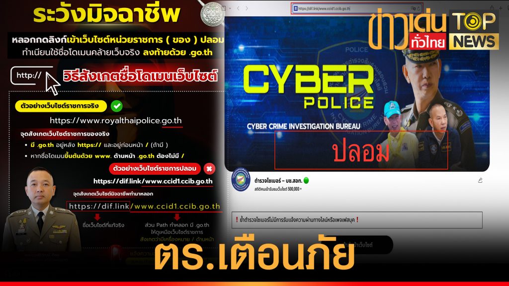 วันนี้ (11 สิงหาคม 2567) พล.ต.ต.ศิริวัฒน์ ดีพอ รองโฆษกสำนักงานตำรวจแห่งชาติ กล่าวว่า พล.ต.อ.ต่อศักดิ์ สุขวิมล ผู้บัญชาการตำรวจแห่งชาติ ได้มีความห่วงใยพี่น้องประชาชนที่อาจได้รับความเสียหายจากอาชญากรรมรูปแบบต่าง ๆ โดยปัจจุบันสำนักงานตำรวจแห่งชาติพบว่าได้มีกลุ่มมิจฉาชีพทำการเลียนแบบโดเมน “.go.th” ซึ่งเป็นโดเมนที่มีไว้สำหรับหน่วยงานราชการ แล้วนำมาใช้ในการหลอกลวงพี่น้องประชาชน โดยมิจฉาชีพจะสร้างลิงก์ที่มีข้อความ “.go.th” ลงท้าย ไว้ในส่วนที่เป็นพาธ (Path) หรือเส้นทางที่นำไปสู่ไฟล์หรือตำแหน่งต่าง ๆ ของข้อมูลบนเว็บไซต์ ซึ่ง Path จะอยู่ด้านหลังของชื่อโดเมนเสมอและคั่นเครื่องด้วยหมายทับ “/” เช่น หากเป็น URL https://www.royalthaipolice.go.th/index.php Path ของ URL ดังกล่าวคือ “index.php” ส่วนเว็บไซต์ปลอมที่สร้างเลียนแบบที่ตรวจสอบพบคือ https://dif.link/www.ccid1.ccib.go.th ซึ่งจะเห็นได้ว่าหากไม่ได้สังเกตให้ดี อาจทำให้เข้าใจผิดว่าเป็นเว็บไซต์ของหน่วยงานราชการที่ลงท้ายด้วย “.go.th” แต่แท้จริงแล้วเป็นเพียง Path ของเว็บไซต์ https://dif.link เท่านั้น