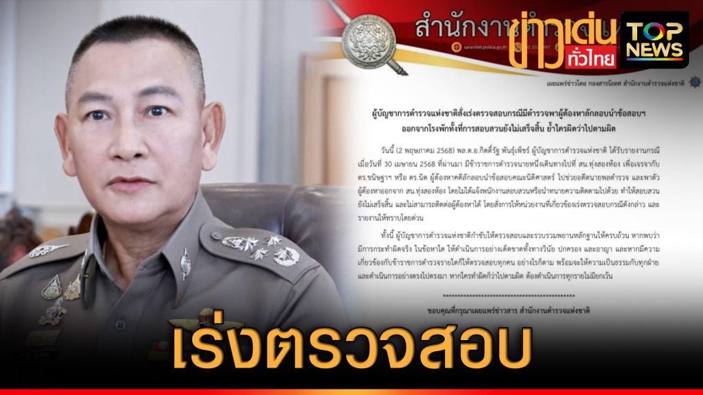 ผบ.ตร. สั่งเร่งตรวจสอบกรณีมีตำรวจพาผู้ต้องหาลักลอบนำข้อสอบฯ ออกจากโรงพักทั้งที่การสอบสวนยังไม่เสร็จสิ้น ย้ำใครผิดว่าไปตามผิด