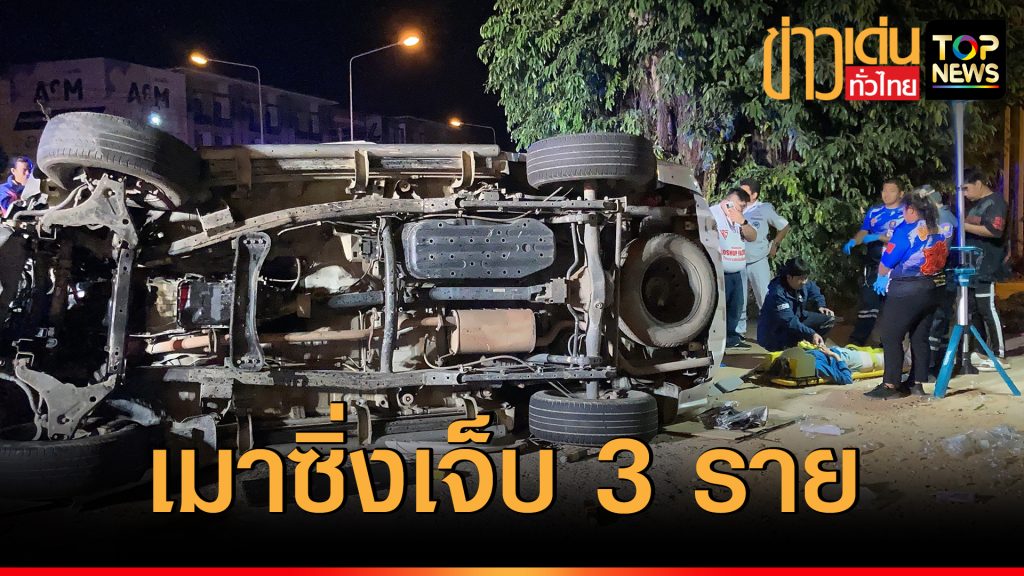 เมา ! ซิ่งชนกระบะจอดริมทางพลิกคว่ำพังยับเจ็บ 3 ราย