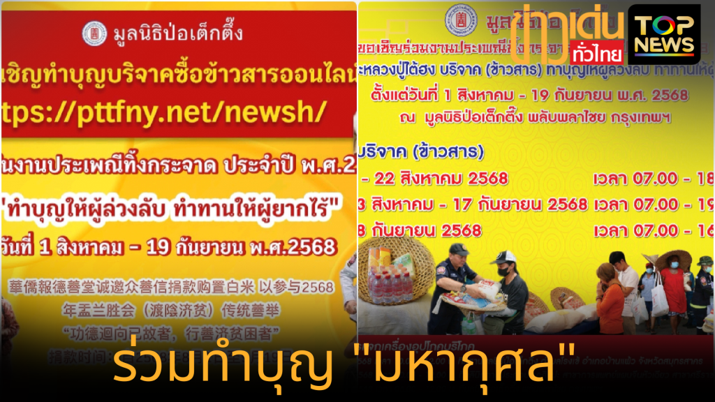 ทำบุญอุทิศส่วนกุศลให้ผู้ล่วงลับ พร้อมทำทานให้ผู้ยากไร้ ณ มูลนิธิป่อเต็กตึ๊ง พลับพลาไชย กรุงเทพฯ ระหว่างวันที่ 1 สิงหาคม – 19 กันยายน พ.ศ. 2568 มูลนิธิป่อเต็กตึ๊ง โดย นายวิเชียร เตชะไพบูลย์ ประธานกรรมการ ขอเชิญผู้มีจิตศรัทธาร่วมงานมหาบุญ มหากุศล ในประเพณีทิ้งกระจาด งานบุญประจำปีที่ยิ่งใหญ่ ที่ผู้มีจิตศรัทธาจะทำบุญบริจาคชุดข้าวสารอุทิศส่วนกุศลให้ผู้ล่วงลับทั้งที่เป็นญาติและไม่ใช่ญาติ พร้อมกับได้ทำทานให้ผู้ยากไร้ โดยผู้มีจิตศรัทธา สามารถร่วมทำบุญได้ 2 ช่องทาง ดังนี้ 1. ร่วมสักการะหลวงปู่ไต้ฮง และทำบุญบริจาคข้าวสารได้ที่ มูลนิธิป่อเต็กตึ๊ง พลับพลาไชย กรุงเทพฯ 2. ทำบุญผ่านเว็บไซต์ทิ้งกระจาดออนไลน์: https://pttfny.net/newsh