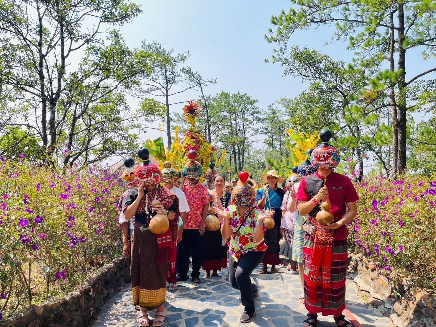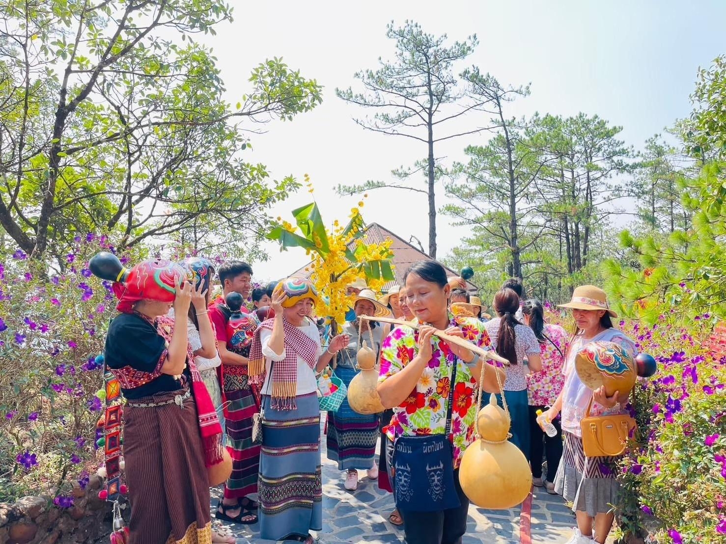 ไทย-ลาว” ที่ชาว อ.นาแห้ว กับชาวเมืองบ่อแตน แขวงไชยะบุรี สปป.ลาว ได้ร่วมกันสร้างขึ้นมาในช่วงฤดูแล้ง ของทุกปี เพื่อช่วยอานวยความสะดวกในการเดินทางข้ามลาน้าเหืองไปมาหาสู่ระหว่างชุมชนทั้งสองประเทศ ในทุกๆ วันพระ – เดินทางถึงวัดศรีโพธิ์ชัย บ้านแสงภา ต.แสงภา อ.นาแห้ว จ.เลย นักท่องเที่ยวร่วมกิจกรรมไหว้พระทาบุญ ภายในสิมโบราณอายุกว่า 477 ปี ชมวิวทิวทัศน์ด้านหลังวัดศรีโพธิ์ชัย บริเวณด้านหน้า อบต.แสงภา ถ่ายภาพเช็คอินกับหอชมวิวต้นดอกไม้ จำลอง และกระท่อม+สะพานไม้ไผ่กลางทุ่งนา หรือจะแวะไปช้อปปิ้งและเลือกซื้อของฝากที่ร้านแม็คเลย บ้านบ่อเหมืองน้อย พร้อมชิมเครื่องดื่มเมนูอร่อยๆ นาคณะนักท่องเที่ยวร่วมกิจกรรมติดประดับดอกไม้สดเพื่อตกแต่งต้นดอกไม้ยักษ์ ร่วมกับชุมชน ชาวบ้านแสงภาตามคุ้มต่างๆ ที่กระจายกันทาอยู่ภายในหมู่บ้าน เพื่อใช้แห่ต้นดอกไม้ยักษ์ในช่วงค่าคืน เมื่อติดประดับต้นดอกไม้เสร็จสิ้นแล้ว ชาวบ้านผู้ชายจะช่วยกันแบกต้นดอกไม้เข้าไปตั้งไว้ที่วัดศรีโพธิ์ชัย นทท. ร่วมกับชาวชุมชนแสงภาจุดเทียนรอบๆ คานหามต้นดอกไม้เพื่อบูชาพระรัตนตรัย โดยมีความเชื่อว่าจะทาให้ ชีวิตของเราเจริญรุ่งเรืองดั่งแสงเทียนที่ส่องสว่างท่ามกลางความมืดมิด